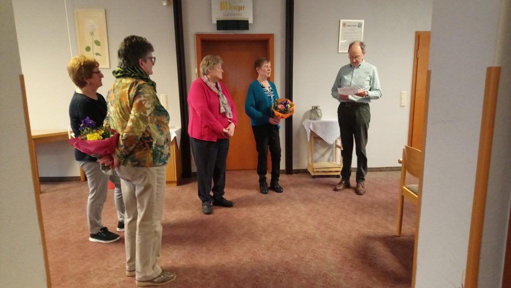 Helmut Enenkel würdigt die Leistungen der ausscheidenden Vorstandsmitglieder M. Lenz und M. Kilian in einer Ansprache. Mit dabei sind die neue 1. Vorsitzende A. Traut und die wiedergewählte 2. Vorsitzende Waltraud Götz